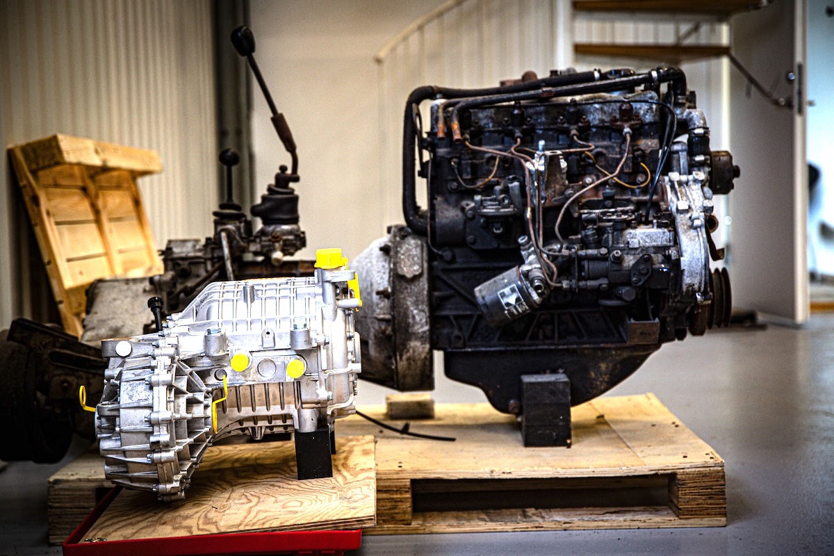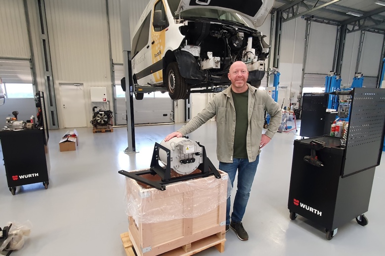 På gulvet foran den ene af bilerne står en grå, cylinderformet metalgenstand monteret på et jernstativ. Det er en spritny elmotor, og selv om den ikke fylder meget mere end en papirkurv, er det den, der fremover skal drive den tonstunge varebil ude på de danske veje.