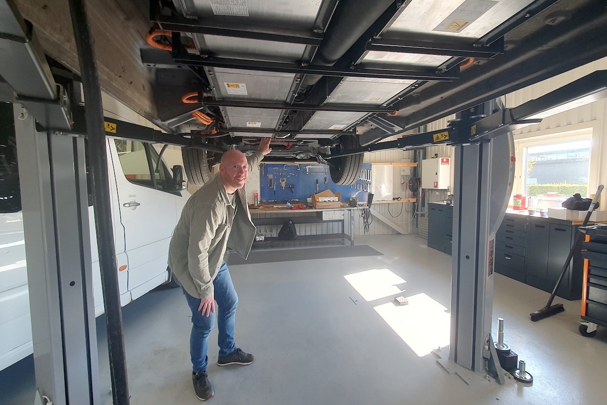 I en moderne værkstedshal i et industrikvarter i Dragør svæver tre Mercedes Sprinter-varevogne i halvanden meters højde – hævet op fra gulvet af solide lifte.